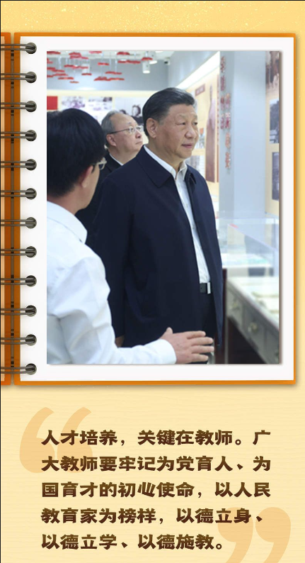 “三寸粉笔,三尺讲台系国运;一颗丹心,一生秉烛铸民魂。”今天的学生就是未来实现中华民族伟大复兴中国梦的主力军,广大教师就是打造这支中华民族“梦之队”的筑梦人。希望全国广大教师把全部精力和满腔真情献给教育事业,在教书育人的工作中不断创造新业绩。