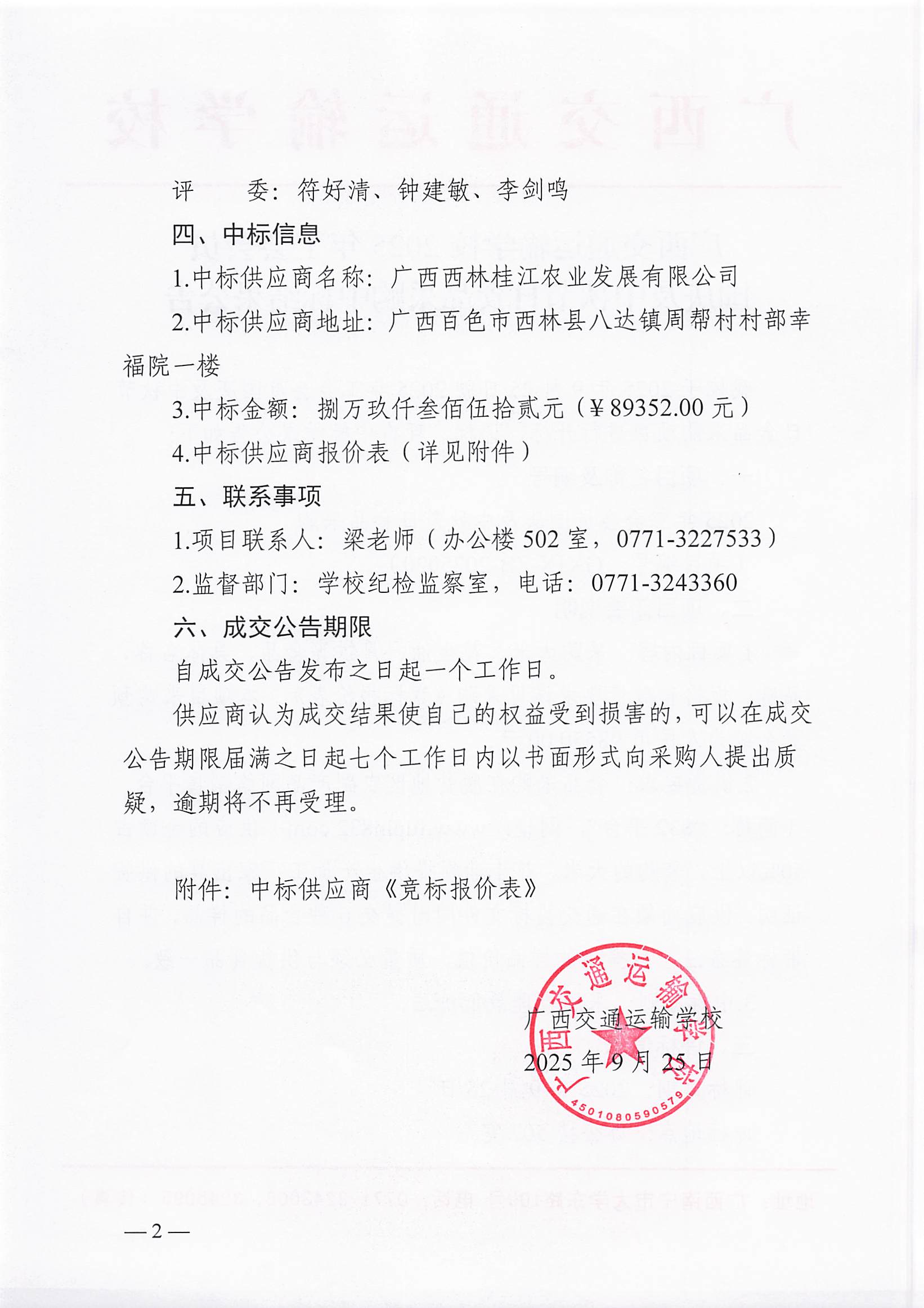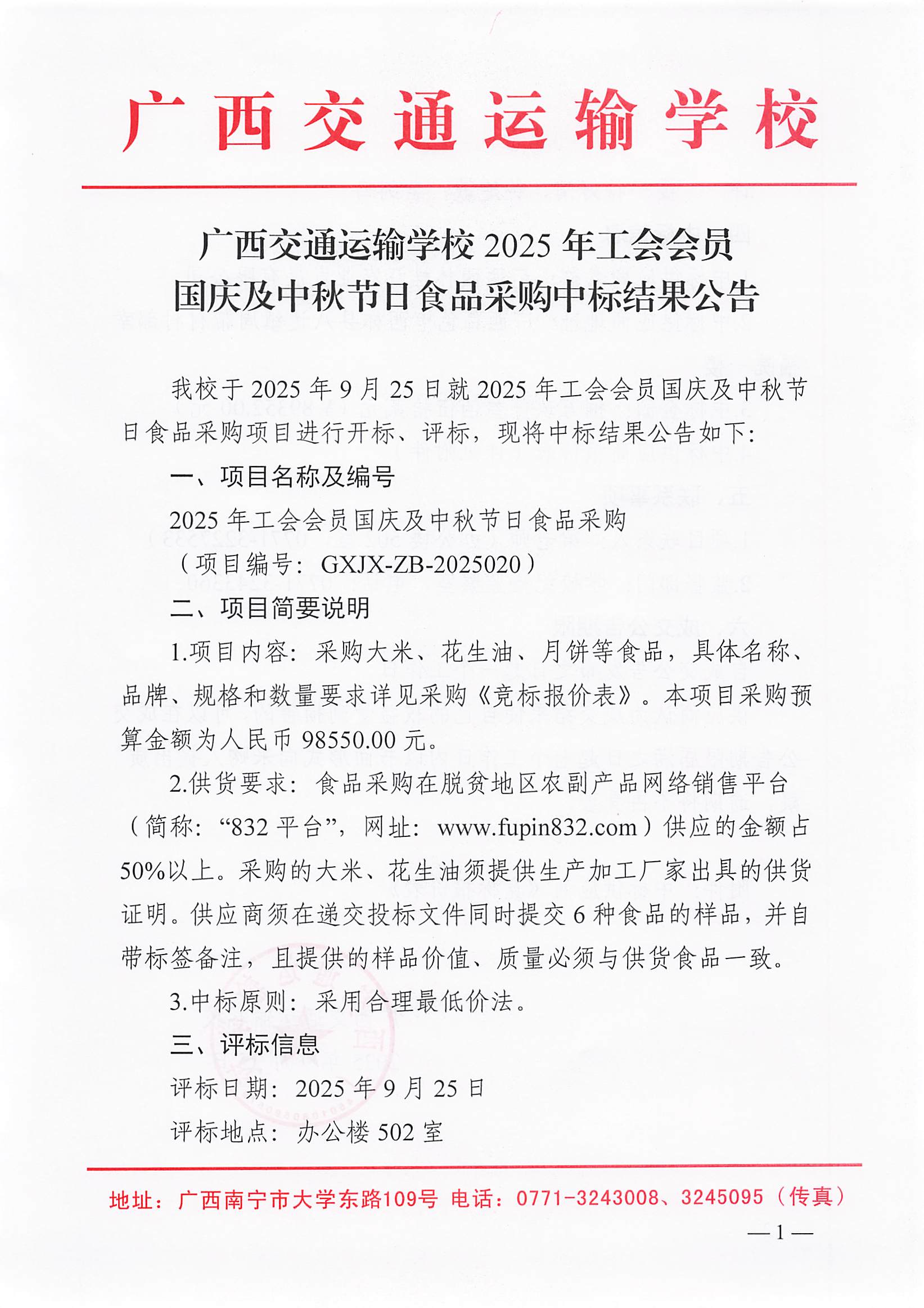 广西交通运输学校2025年工会会员国庆及中秋节日食品采购中标结果公告
