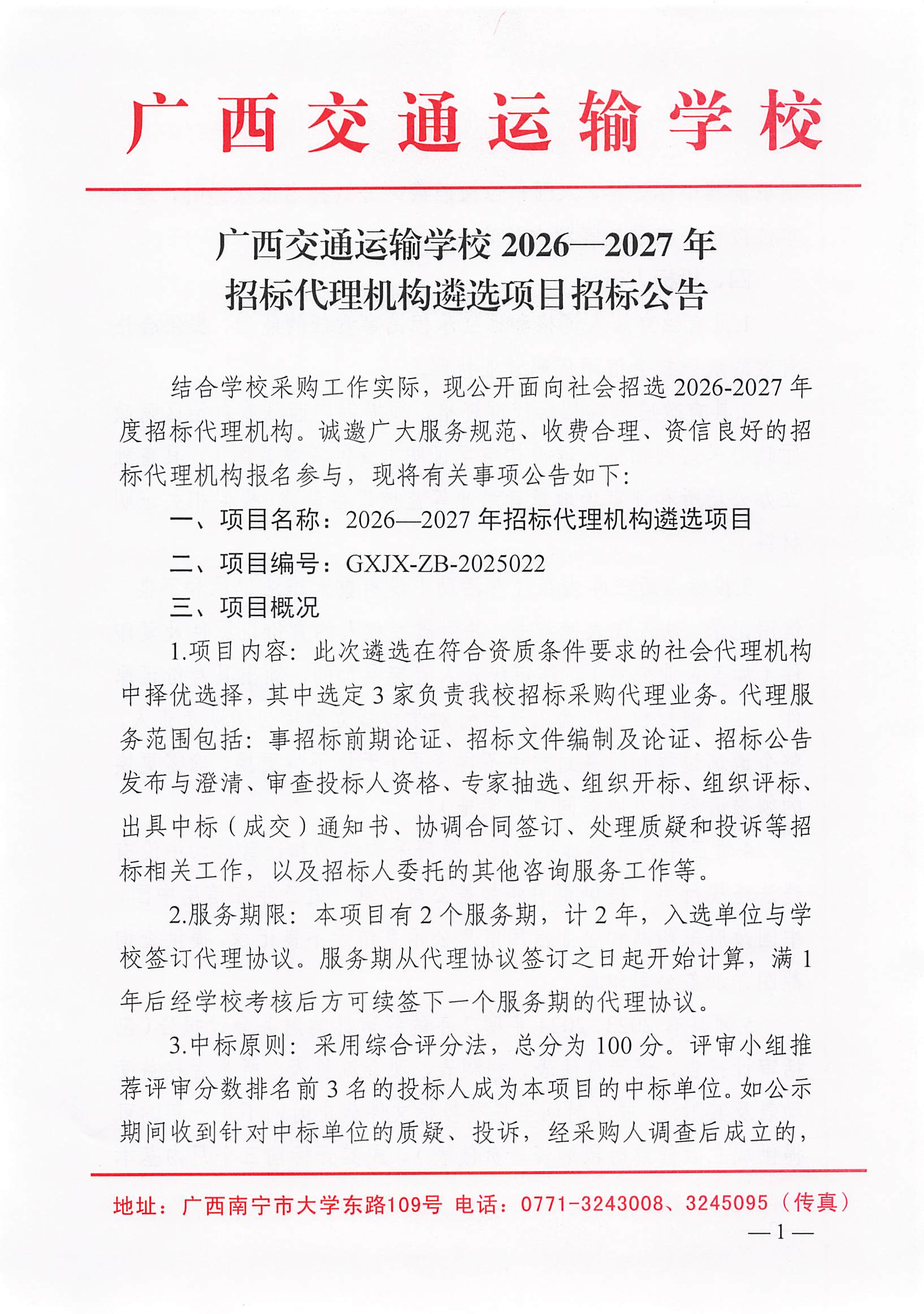 广西交通运输学校2026—2027年招标代理机构遴选项目招标公告