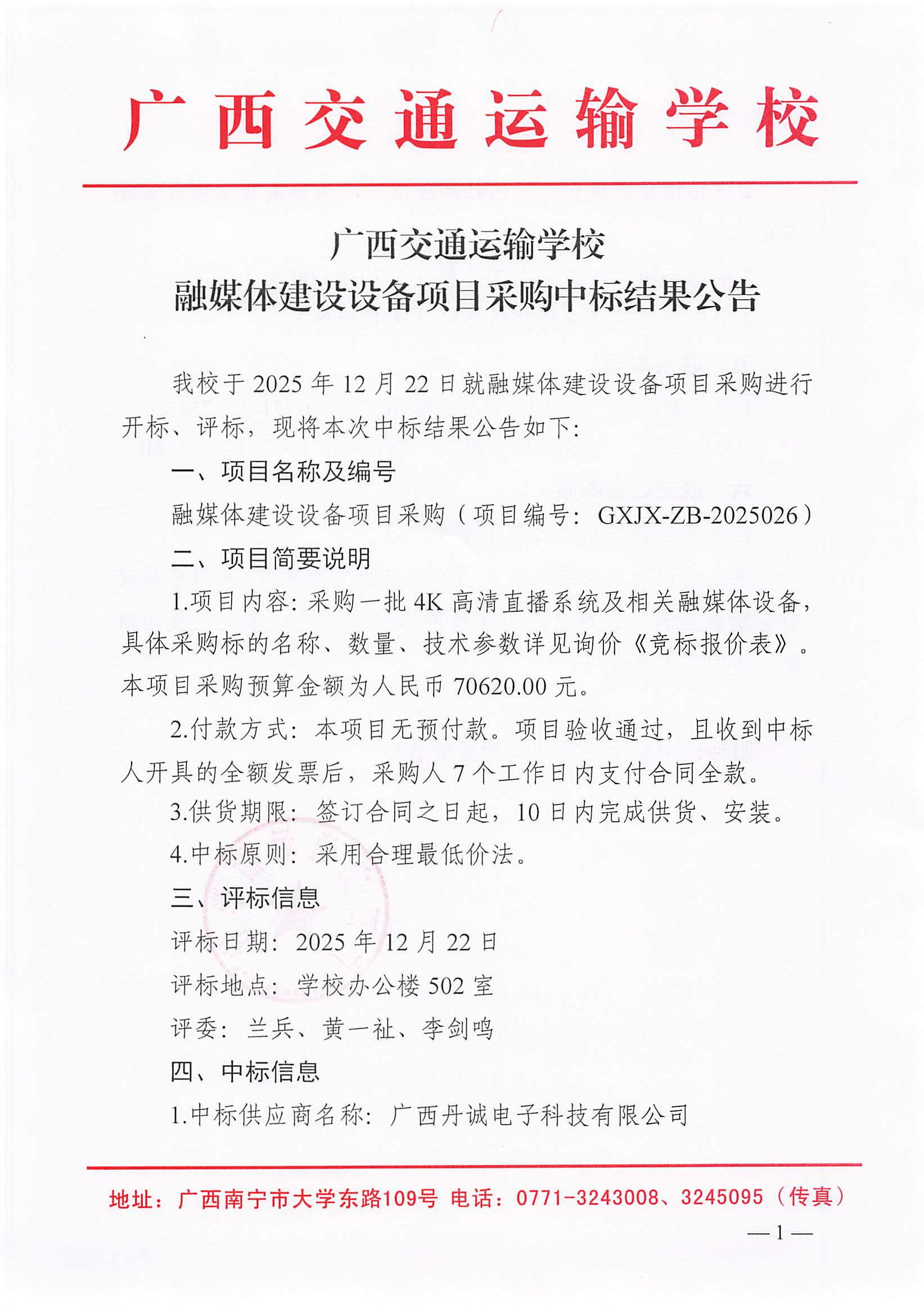 广西交通运输学校融媒体建设项目设备采购中标结果公告