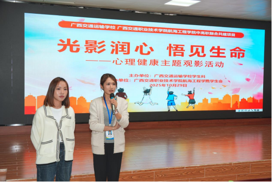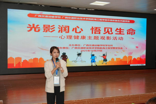 为深化心理育人成效,促进中高职协同育人,10月29日晚,广西交通运输学校与广西交通职业技术学院航海工程学院联合举办“光影润心,悟见生命”心理健康主题观影活动。两校共200余名学生齐聚广西交通运输学校实训楼报告厅,共同观看了治愈系电影《心灵奇旅》,并在观影后围绕生命意义展开深入交流与分享。