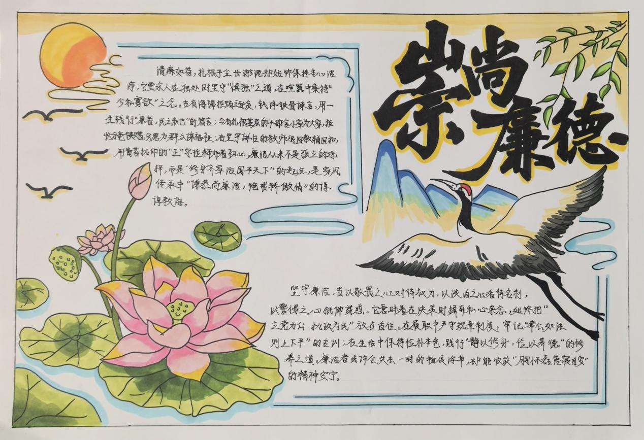 近日,由校团委主办,书法社团、美术社团精心策划承办的广西交通运输学校“清风育德守初心,廉洁笃行担使命”主题书画、手抄报比赛圆满落幕。比赛旨在以笔墨传情、以版面载意,让廉洁清风浸润校园每个角落,为校园文化注入清廉正能量。