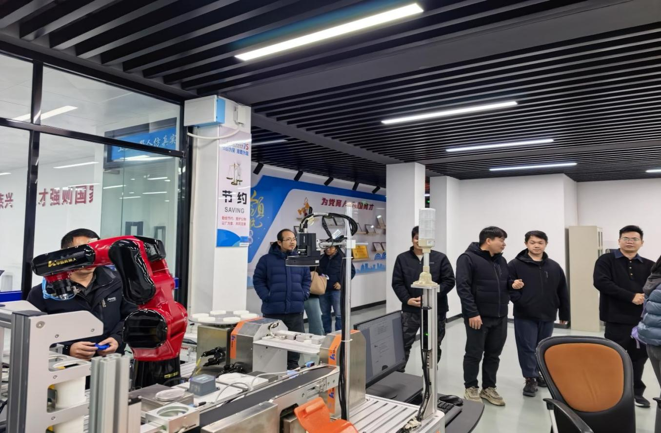 座谈会上,韦朝添主任对梧州二职同仁的到来表示热烈欢迎。他简要介绍了学校及智能工程系的发展概况,并重点分享了工业机器人虚拟仿真实训基地的建设经验与实践案例。随后,双方围绕专业群构建思路、课程体系优化路径、技能竞赛科学备赛策略等议题,展开了坦诚而深入的讨论。梧州二职代表团表示,此次交流活动启发了专业建设的新思考,尤其在技能竞赛组织、跨专业教学资源整合等方面获得了宝贵经验。