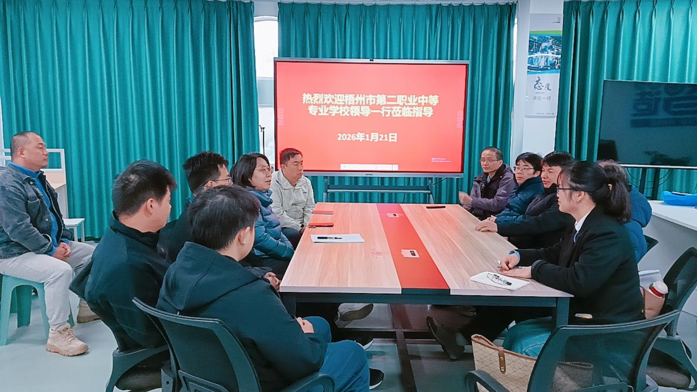 2026年1月21日梧州市第二职业中等专业学校培训办公室副主任谭莹率交流团一行6人到访我校,开展专业建设交流活动。我校智能工程系主任韦朝添及相关专业带头人热情接待并参与交流。