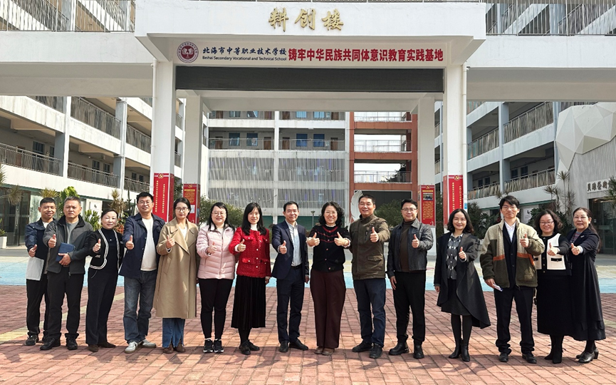 本次调研首站为北海市中等职业技术学校。杨华军副校长热烈欢迎调研团队,陪同走访校园及教育基地,带领调研团队参观学校贝雕非遗博物馆和民族工艺(南珠贝雕)文化传承创新职业教育基地,直观感受现代工艺对非遗文化传承发扬的示范引领作用,并在座谈会上以邮轮乘务、高速铁路乘务等特色专业内涵育人价值与实现途径为例,深入交流“三全育人”典型成功经验。